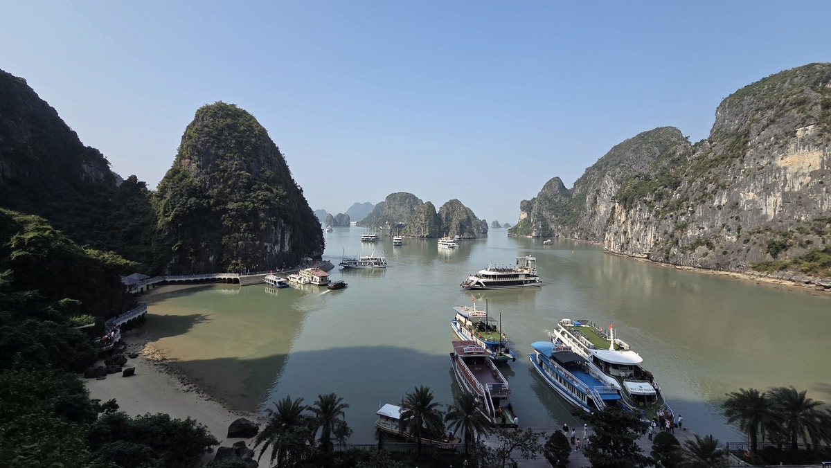 Płyniemy następnie na wyspę z plażą i punktem widokowym. Tu jest opcja na pływanie, chociaż patrząc na wielkość wygrodzonego terenu to szkoda nawet wchodzić do wody 🤷♂️ podeszliśmy na punkt widokowy, zrobiliśmy zdjęcia, na których widać ile tych statków tam jest i poszliśmy na dół. Znowu mamy mocno ograniczony czas i mam wrażenie, że jeszcze go docinają bardziej.