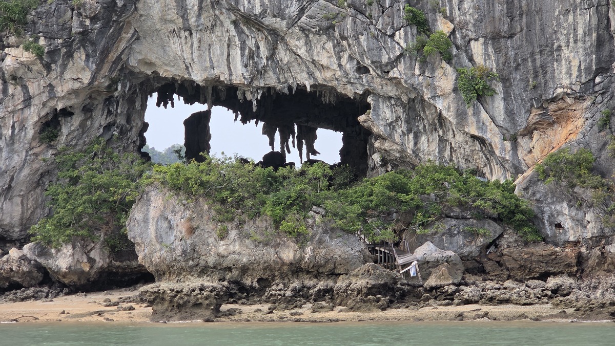 Poszliśmy na kajaki i znowu z zegarkiem w ręku, macie być wtedy i wtedy. Płyniemy kajakiem przez jaskiniowy przesmyk, wszędzie pełno kajaków, albo bambusowych łódek, tłum, głośno, chaotycznie. Zaletą kajaka jest to, że można płynąć samemu i trochę głębiej na jeziorko. Tam bambusowe łódki już nie płyną, bo ich napęd to głównie odpychanie się od dna. Na prawym brzegu są małpki i fajnie sobie na nie popatrzeć, na pewno lepiej niż na to całe towarzystwo z lewej strony na łódkach, które się drze. Popływaliśmy swoje dwadzieścia pięć minut i wróciliśmy się o czasie na łódkę.