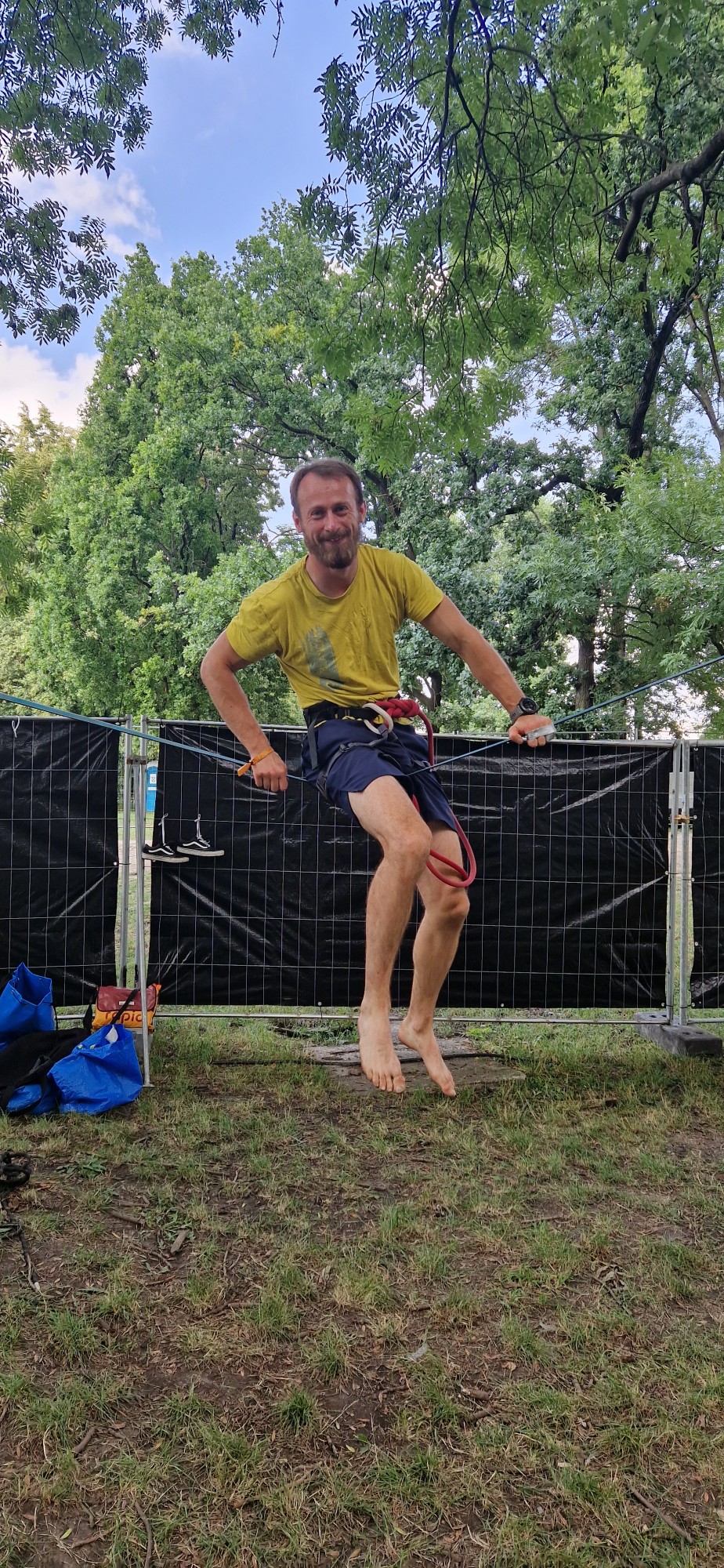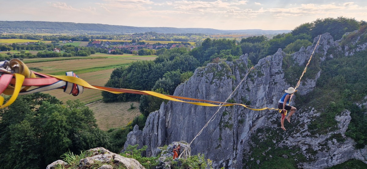 Po festiwalu w Lublinie, wielokrotnie byłem na taśmie w Bolechowicach pod Krakowem. Bardzo dużo też pomagały mi treningi w Parku Jordana. Nasze społeczność ma regularne spotkania, gdzie można się zintegrować i poćwiczyć na wielu różnych taśmach. Każde wyjście na highline wiązało się ze stresem, walką o położenie pierwszej, a następnie drugiej nogi. Walki z własnymi ograniczeniami i oczekiwaniami. Nauki dostrzegania progresu w małych rzeczach, jak chociażby czas spędzony na taśmie. Pierwsza sesja w Bolechu była zweryfikowaniem moich poprzednich osiągnięć. Z sytuacji, gdzie czułem, że lada moment wstanę okazało się, że się boję, że mam oczekiwania i nie mogę się przełamać, żeby chociaż dołożyć drugą nogę.