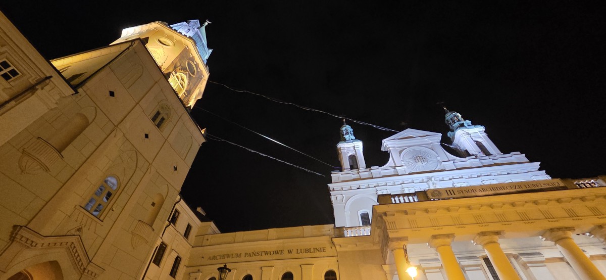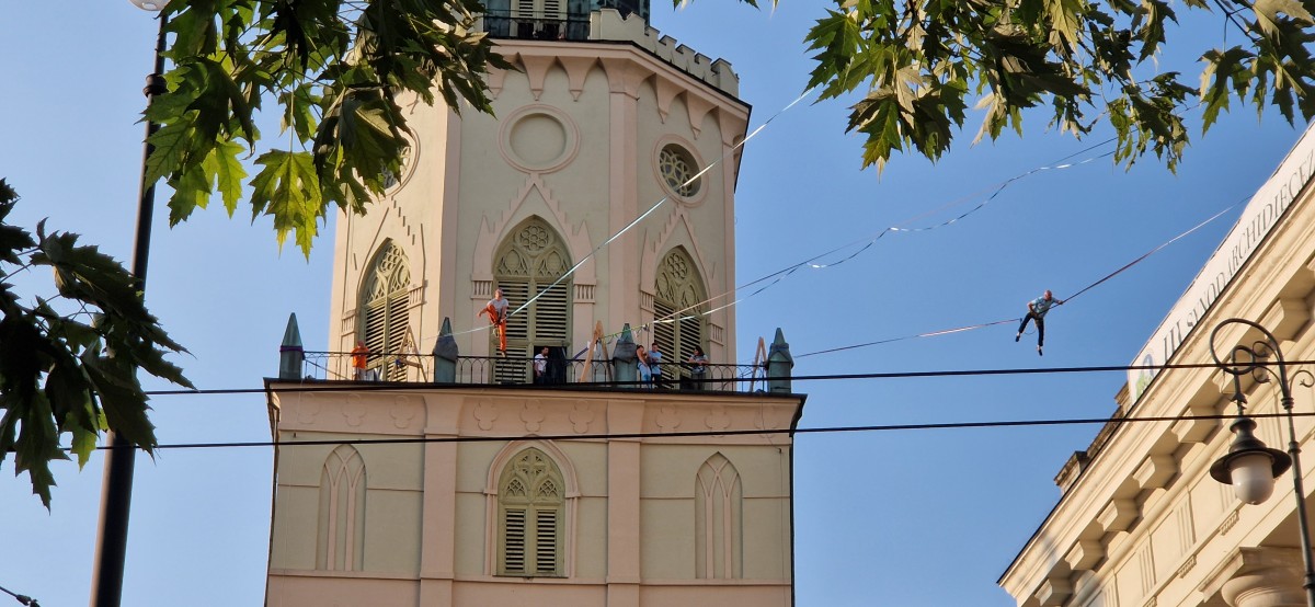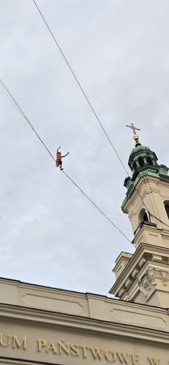 Byłem wtedy na końcówce wypowiedzenia i przyjechałem sobie do Lublina z samego rana. Poszedłem na śniadanie na miasto, bo rejestracja była zamknięta i tam poznałem Katharinę. Pomagałem jej w dogadaniu się z obsługą hostelu. Nie do końca się dogadałem, ale skończyłem z darmowym śniadaniem. Popracowałem chwilę w kawiarni, a później poszedłem się zarejestrować. Rozbiłem się na polu namiotowym i wylądowałem na Trybunale. To jest w ogóle mega uczucie, że kiedy się jest uczestnikiem festiwalu, to można wchodzić na dachy i piętra budynków, albo wieże kościołów, które normalnie są niedostępne. No więc poszedłem na Trybunał, zobaczyłem że ktoś jest na taśmie i w dodatku ludzie, którzy też dopiero zaczynają uczą się wstawać, albo robią po kilka kroków. To była dla mnie duża ulga, bo jadąc na festiwal miałem poczucie, że jestem za słaby i że to może nawet nie mieć sensu. Jest wprost przeciwnie, bo festiwal w Lublinie ma bardzo dużo taśm dla początkujących, a cała społeczność highline jest bardzo otwarte i zachęca do próbowania i nauki chodzenia na taśmie.