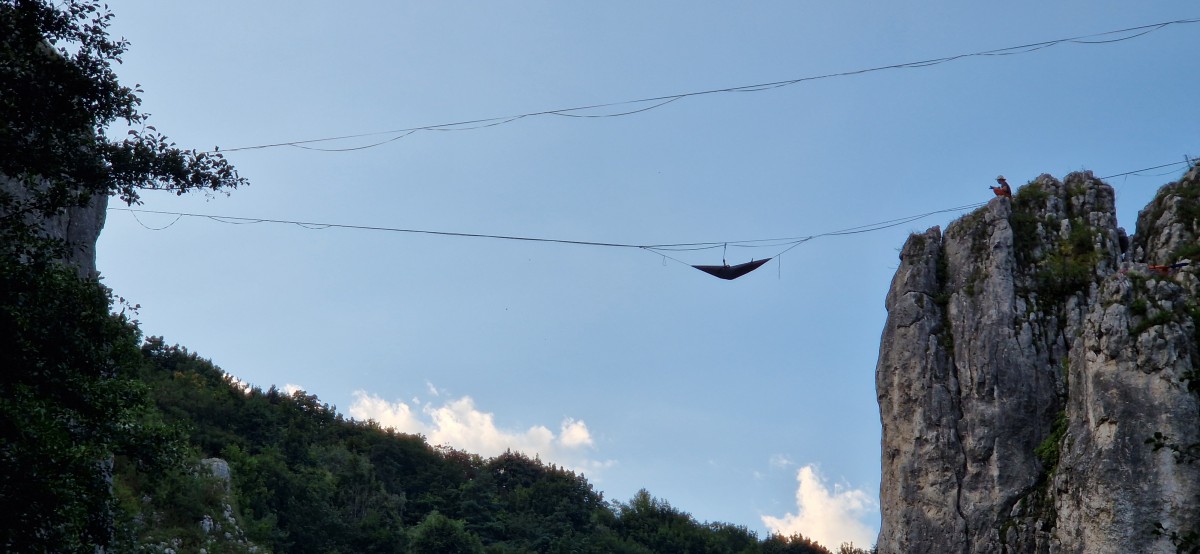 Widząc jak to wygląda, i że jedna taśma jest wolna, poprosiłem obsługę o sprawdzenie mojej ósemki i wyszedłem przez okno. Nie miałem jeszcze wtedy rollexa/rolki, więc wszystko robiłem na rękacha. Rolka służy do wpięcie się do taśmy i daje możliwość wyjechania na niej. Bardzo pomocne, bo żeby wejść na taśmę, trzeba trochę odjechac od krawędzi, żeby nie uderzyć w ścianę w przypadku lotu. Wyszedłem więc na odpowiednią odległość na łapkach jak małpka. Nie pamiętam już, czy się puściłem i wisiałem, czy usiadłem, ale to było naprawdę przedziwne uczucie. Wiszenie w powietrzu. Pamiętam, że sobie tak wisiałem i obserwowałem co się dzieje w mojej głowie. Wyizolowany strach, bycie w kompletnie bezpiecznym środowisku i o tym wiedziałem, ale dla mojego organizmu było to śmiertelne zagrożenie i zupełnie nowe doświadczenie. I sobie tak wisiałem i się oswajałem. Później udało się usiąść i dalej obserwować to uczucie. Po kilku minutach wróciłem do okna. I tak oto festiwal zaczął się dla mnie festiwal i moja przygoda z highlinem.