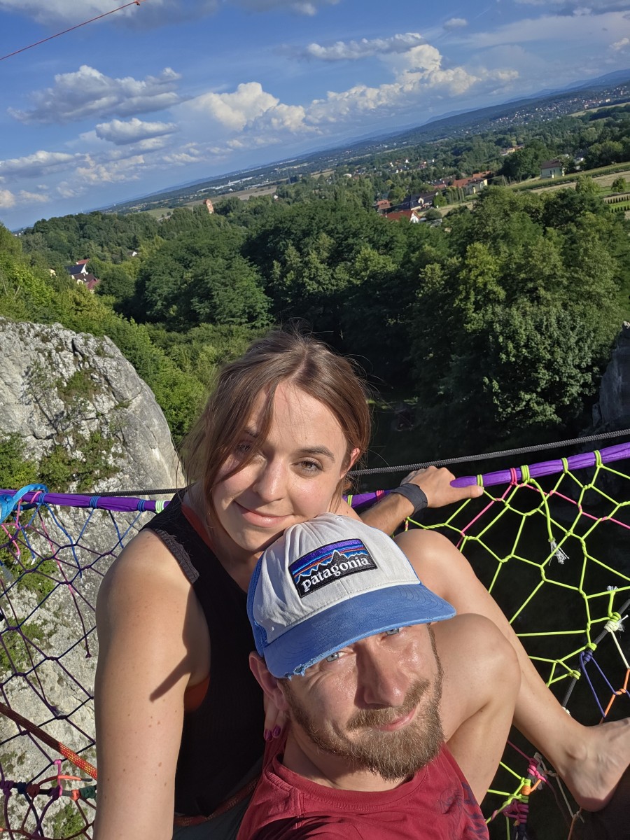 Ze znaczących wydarzeń highlinwowych po festiwalu, to pomagałem przy wieszaniu Spacenetu w Bolechowicach. To był nasz lokalny projekt dowodzony przez Krzyśka. Spacenet to taka siatka, rozciągnieta przy pomocy taśm, na której można sobie usiąść. Taki lepszy hamak, bo zmieści się na nim więcej osób. Lubię highline za ten element sprzętowy i zabawy z wysokością. W każdym razie, wziąłem Magdę na spacenet, jako jej highlineową inicjację i mimo, że trochę się bałem, że coś pójdzie nie tak, to wszystko się udało. Był mały problem przy przepinaniu się na siatkę, ale udało się to na spokojnie ogarnąć.
