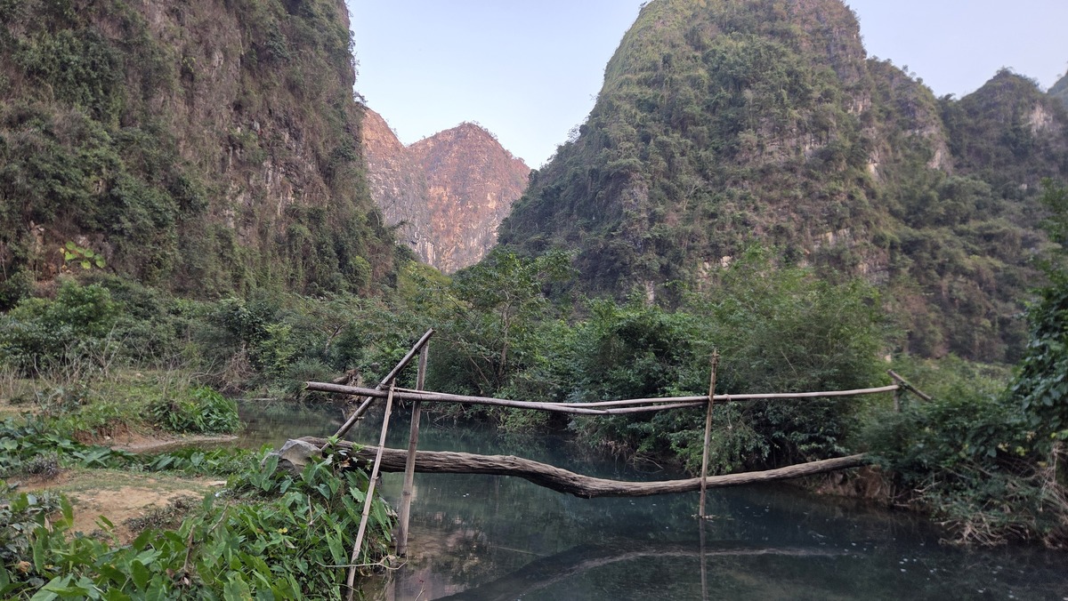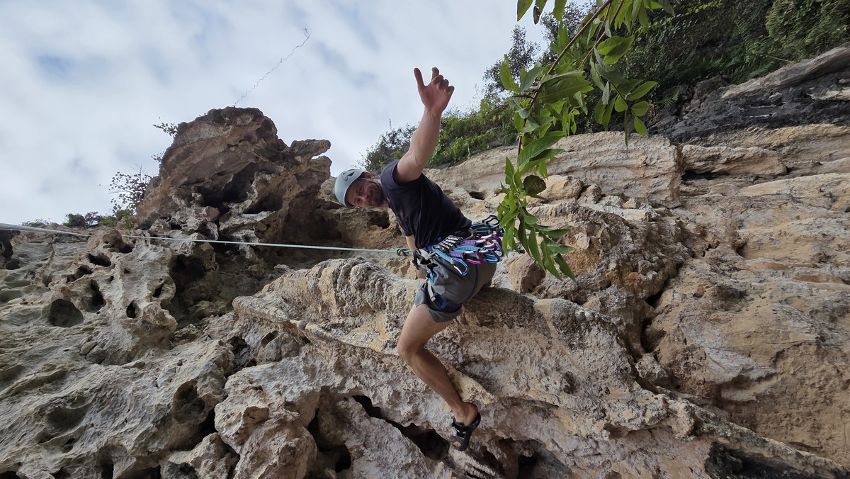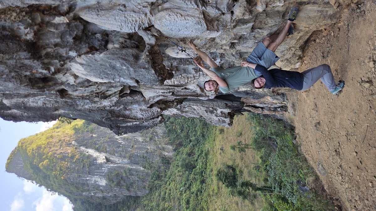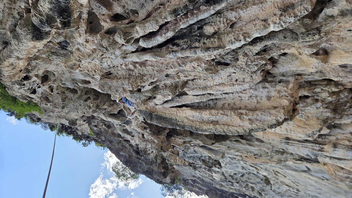 W miarę szybko udało się znaleźć miejsce do zostawienia motoru (na ścieżce między polami ryżowymi) i ścieżkę pod skałkę. Podejście wiodło przez poletko, a następnie stromo w górę, wchodząc na mini przełęcz, zaraz za którą po prawej stronie była ścianka. Jestem zmęczony po trzech dniach wspinania, więc dzisiaj zaczynam od czegoś łatwiejszego (czyli jak codziennie). Droga nazywała się Babylon Spirit i była za 6a+. Następnie zrobiłem drogę obok i całkiem nieźle zbułowany doszedłem do połogu. Tam udało się jakoś dotrwać aż do stanu. Fajnie, czuję że wspinanie zaczyna do mnie wracać. Robimy przerwę na lunch, a następnie wstawiam się w 6b (5c bez ostatnich 2 wpinek). Tym razem droga była dużo łatwiejsza w odczuciu. Idąc pominąłem dwie wpinki, żeby uniknąć przysztywnienia liny. Teren był latwy, a ja czułem się pewnie. Ostatnie metry były otickowane, więc nawet nieszczególnie musiałem się męczyć szukając chwytów.