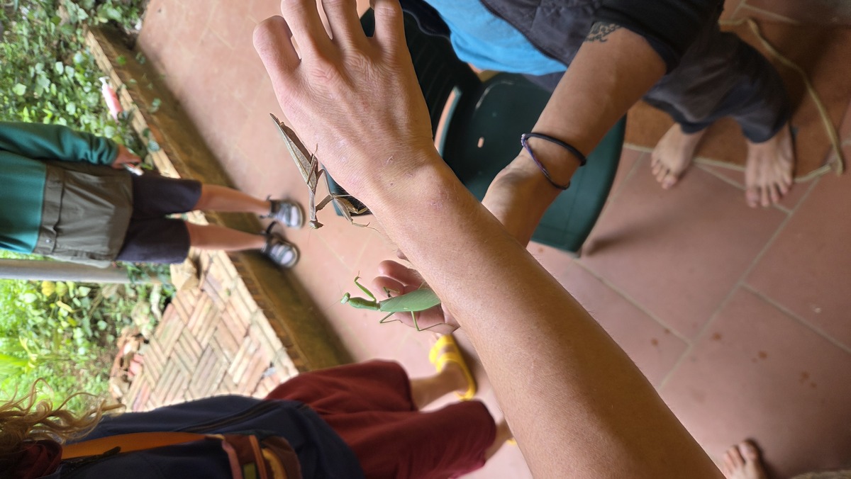 Dojście do skałki było mega dziwne. Szło się przez podwórko do zamkniętego ogrodu-kurnika, przechodziło przez murek i potem przez sad porośnięty rzepopodobnymi roślinami pod skałę. Co najmniej dziesięć minut zajęło mi odczepienie wszystkich nasion z moich ubrań. W drodze powrotnej udało się ograniczyć liczbę rzepu. Za to po wyjściu z podwórka czekała nas niespodzianka. Przy stole siedziała cała rodzina i mieli jakąś imprezkę. Strasznie nalegali żebyśmy siedli z nimi i zjedli. Mieliśmy jedzenie w naszym plecaku i chcieliśmy je zaraz zjeść, a nawet jakbyśmy go nie mieli, to tamto jedzenie nie wyglądało jakoś super apetycznie. Po zdobyciu hasła do wifi udało się jakoś wypisać z imprezy, ale trochę to zajęło i nie czułem się tam super komfortowo. To było bardzo dziwne.