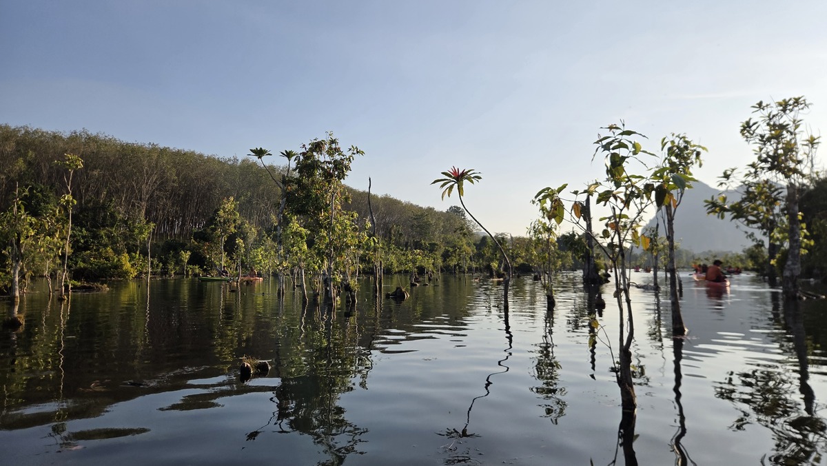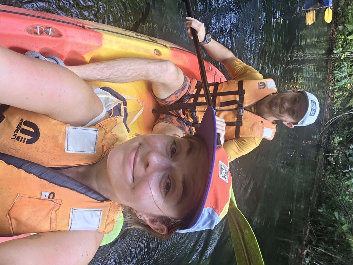 Kajaki były na zalewie, spod którego wyrastały drzewa i wystawały pnie ściętych drzew. Interesujące doświadczenie, ale nie czuje potrzeby powtarzania tego. Najpierw płynęło się do lasu, na końcu którego był “emerald pool”. Chwilę wcześniej było też miejsce do kąpania się, ale trochę tricky, bo w miejscu przez które przepływało się kajakiem. Na początku nasz przewodnik popłynął przodem i kiedy dopłynęliśmy do miejsca do pływania, zamotaliśmy się trochę i zrobiliśmy kółko.