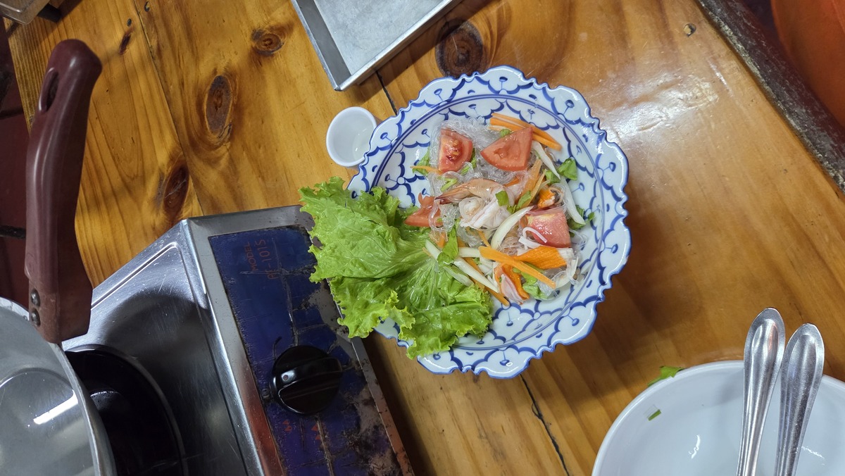 Po zrobieniu mojej sałatki, przeszliśmy do stanowisk z palnikiem, gdzie Magda we wrzącej wodzie ugotowała makaron (kilka sekund trzymania go na łyżce), a następnie krewetki. Do sałatki dodała sos rybny, sok z cytryny i syrop cukrowy, tworząc przyjemną kombinację smaków.