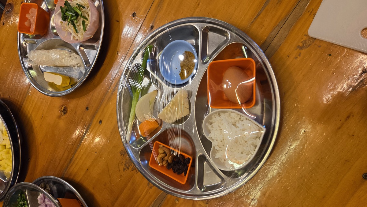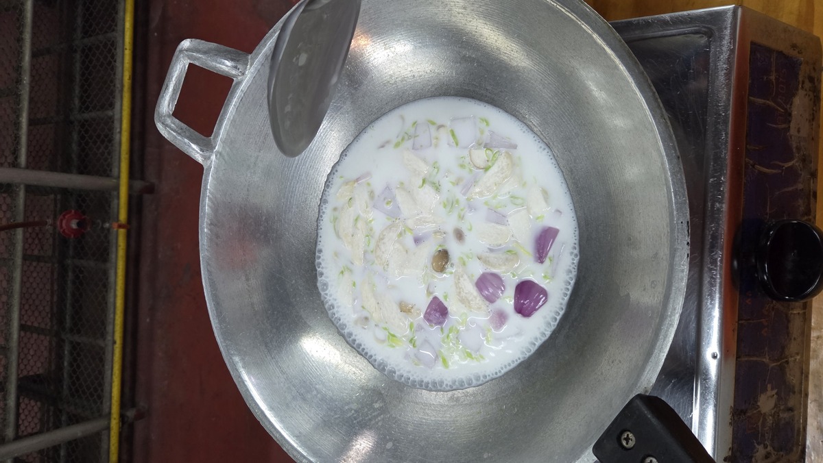 Ostatnie dania, które gotowaliśmy to curry. Ja robiłem khao soi, które w sumie jest bardzo prostym daniem i opiera się na paście, której niestety nie robiliśmy sami. Do pasty rozgrzanej na oleju dodaje się mleczko kokosowe, kurczaka i przyprawę curry. Do tego jeszcze sos rybny i cukier kokosowy, żeby nadać smak. Pozostałe skladniki, czyli cebula i kolendra to raczej dekoracja. Do miski wkłada się ugotowany makaron jajeczny, to zalewa się powstałym daniem i na górę daje się makaron z głębokiego tłuszczu (taki chrupek), czerwoną cebulę i kolendrę.