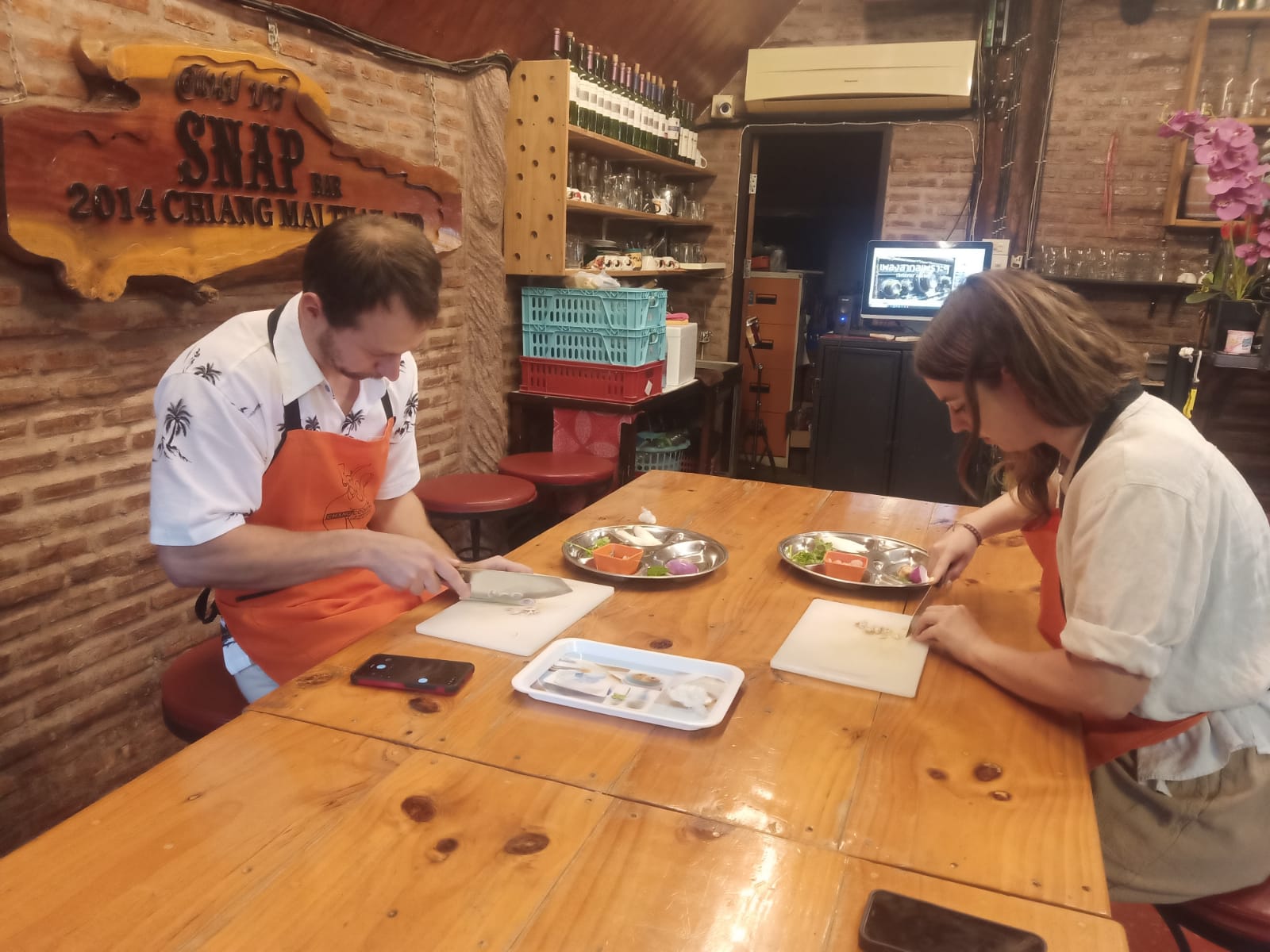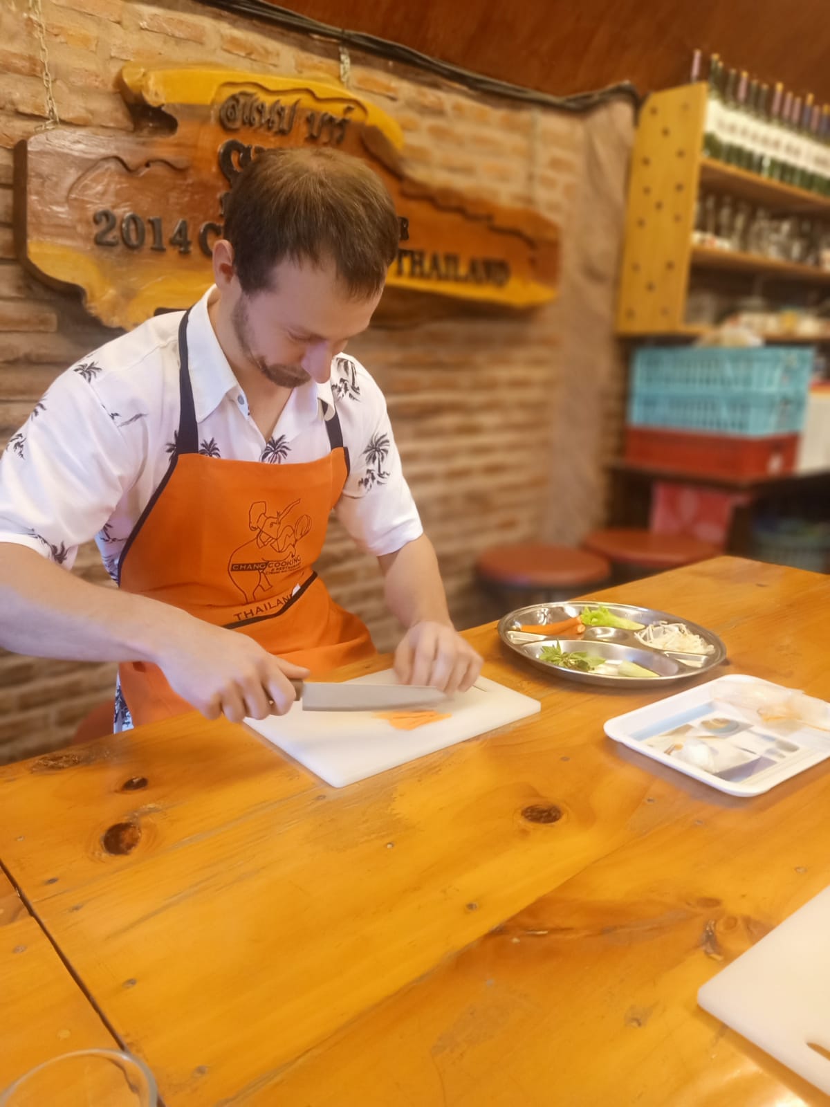 Później pojechaliśmy do miejsca, gdzie odbywały się zajęcia. Byliśmy tylko we dwójkę, więc mieliśmy pełnię uwagi 😀 Zaczęliśmy od sałatki, żeby móc coś zjeść zanim przejdziemy do głównych dań. Ja robiłem spring rolle, a Magda sałatkę z makaronu ryżowego. Spring rolle w sumie banalnie proste. Arkusz papieru ryżowego do którego wkłada się pocięte w małe paseczki warzywa, mięso, cokolwiek. To się zawija i gotowe. Najlepszy z tego był sos sweet chilli, ale chyba był kupny.