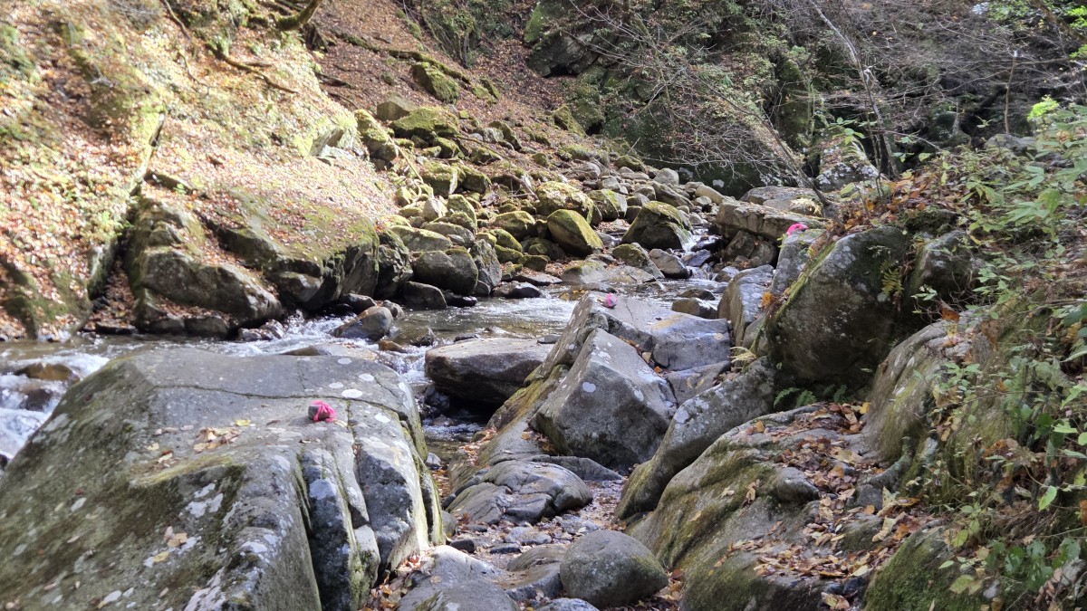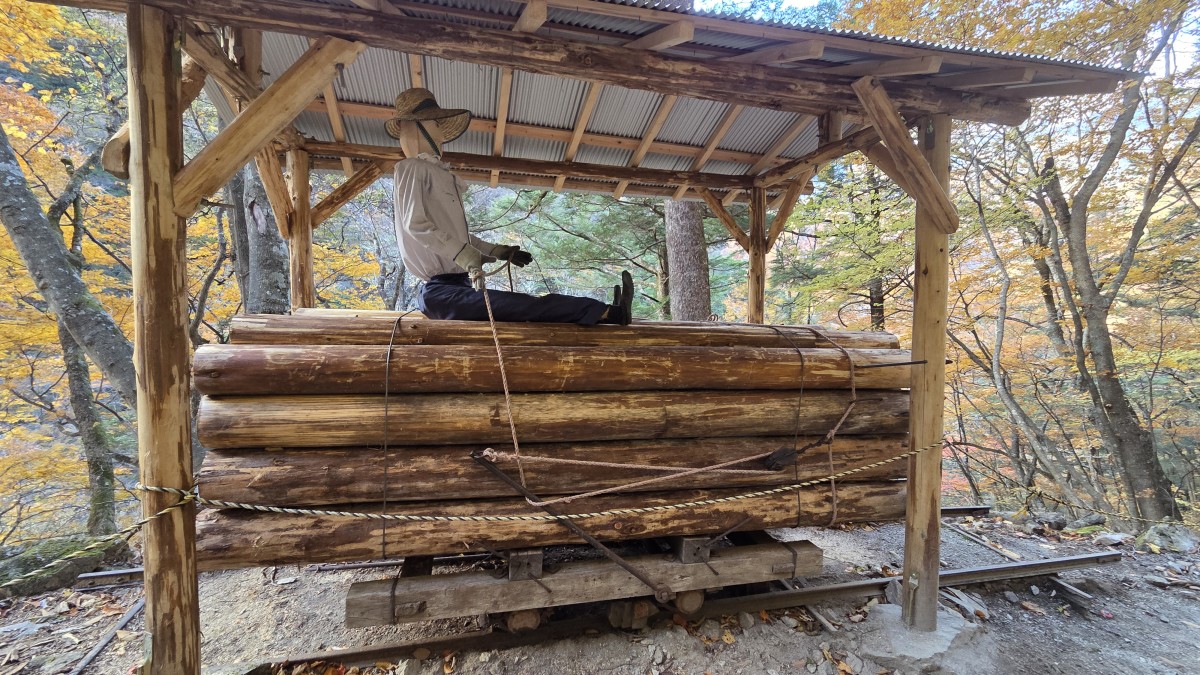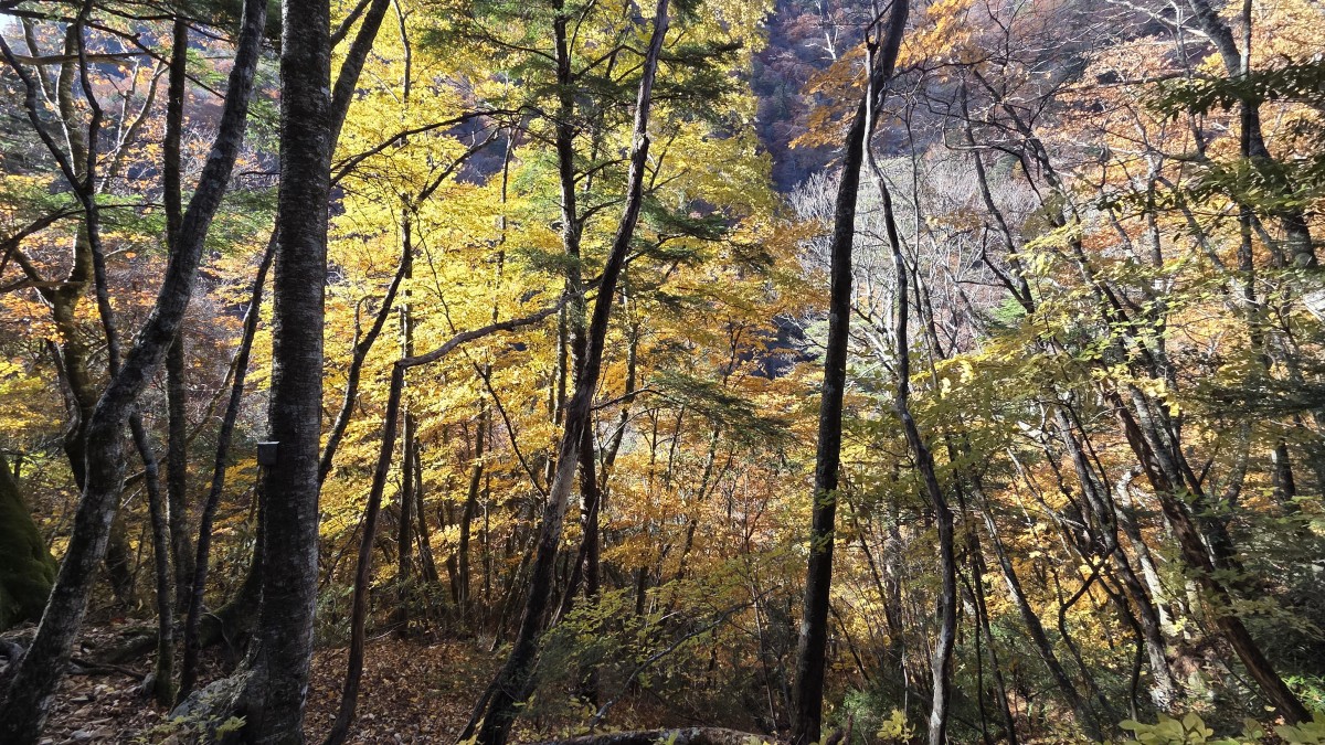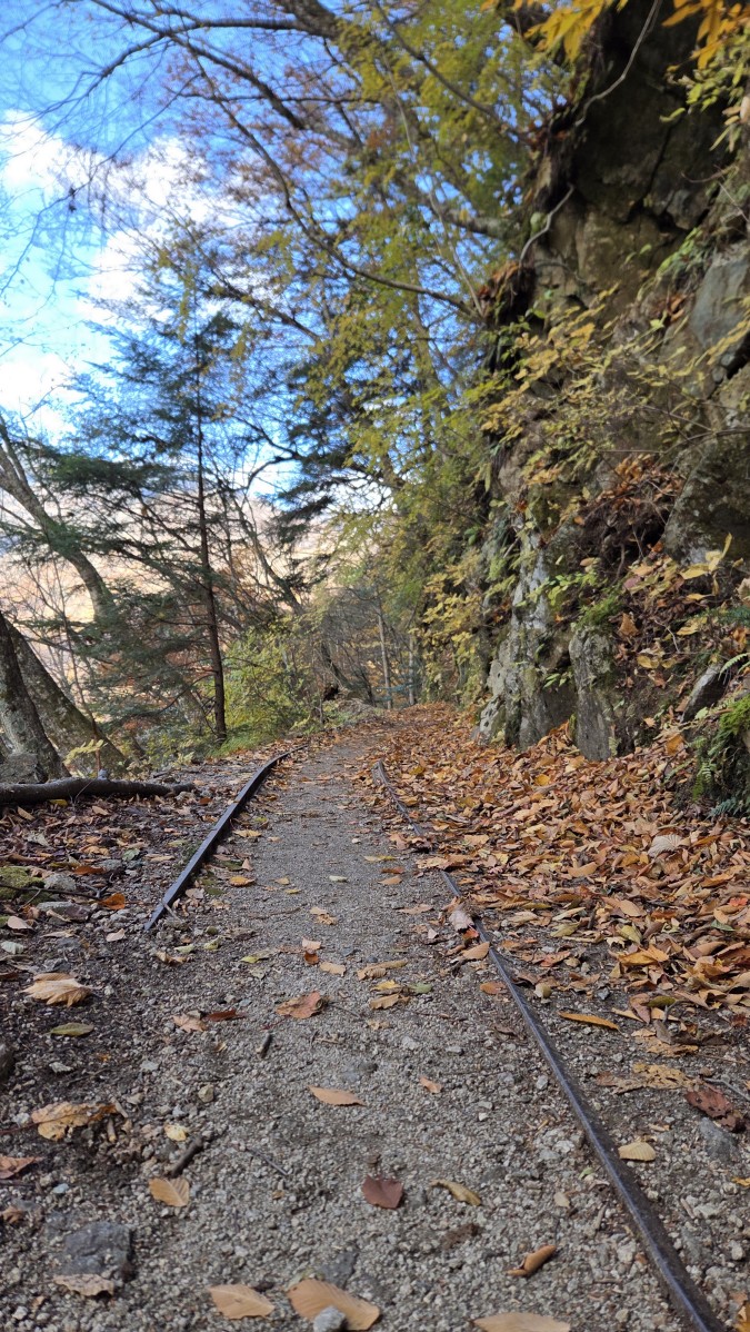 Druga połowa szlaku była dużo łatwiejsza niz pierwsza. Poprowadzona górą, z daleka od wody. Było to łagodne zejście biegnące po starym szlaku, który służył do zwożenia drzewa przy użyciu wózków. Z tego powodu co chwila napotykaliśmy na pozostałości po szynach kolejowych. Wokół nas były w zasadzie same lasy, do tego w pełnej swojej jesiennej okazałości. Cieszyliśmy oczy wszystkimi barwami jesiennych liści. Ta część poszła nam bardzo szybko, tym bardziej, że chcieliśmy jeszcze dojechać spokojnie do świątyni Mitsumine.