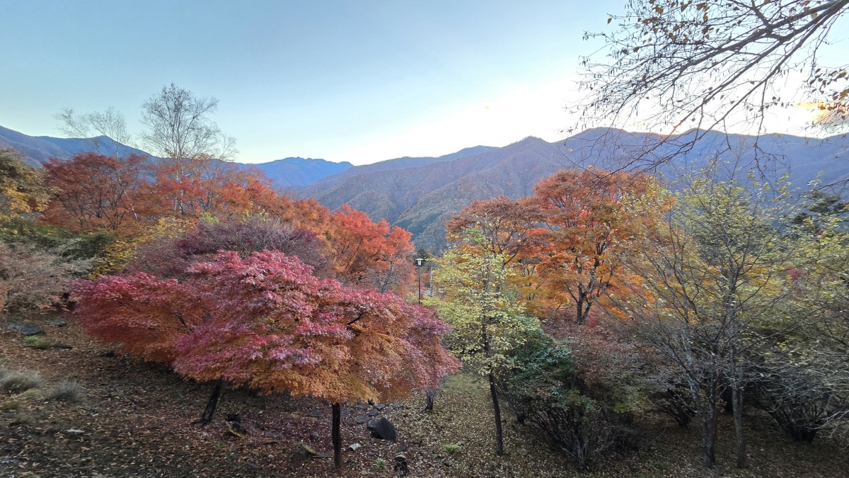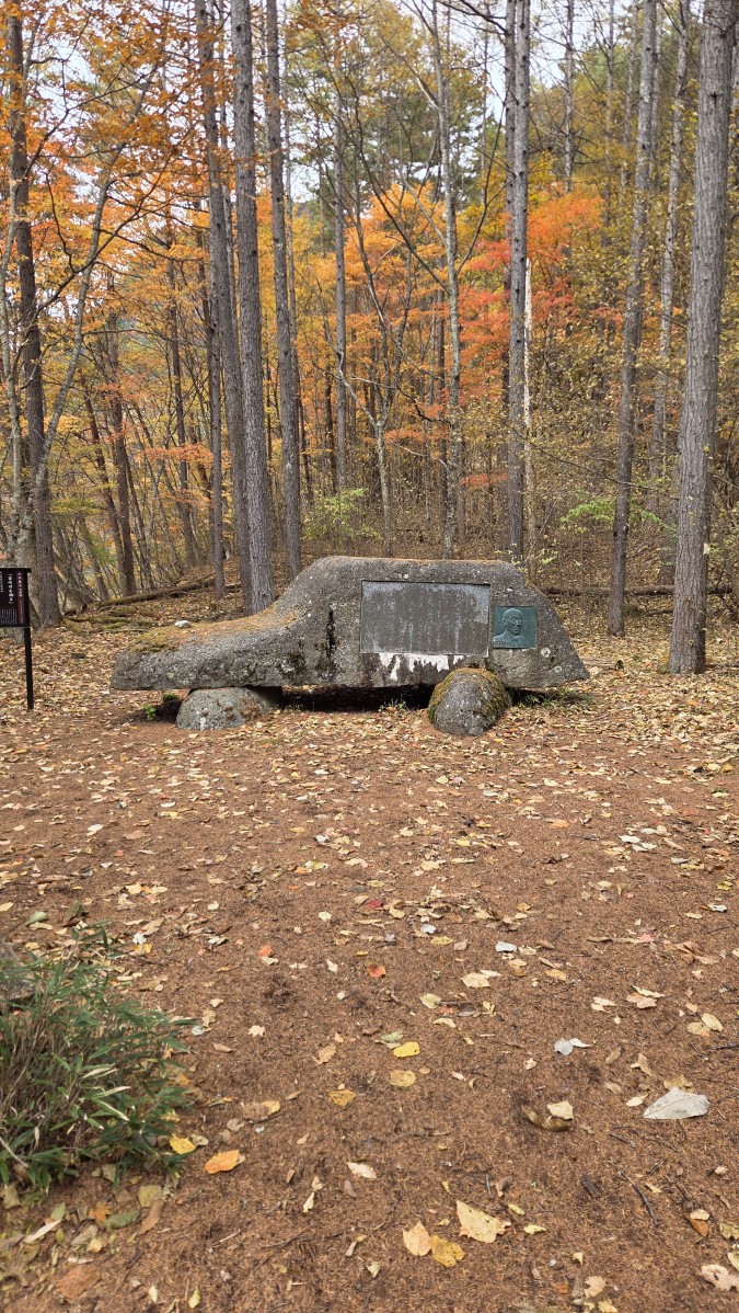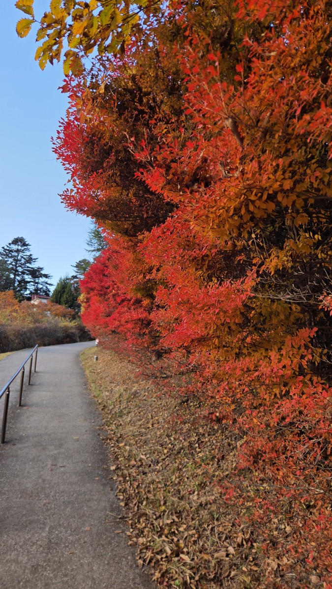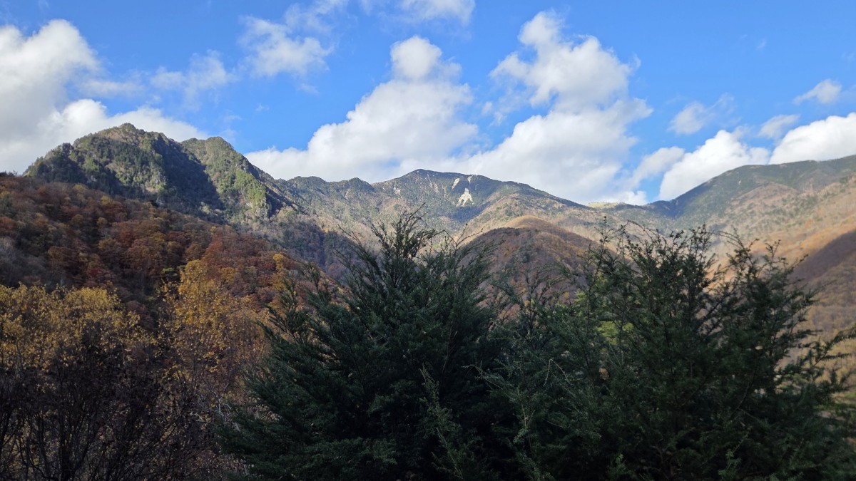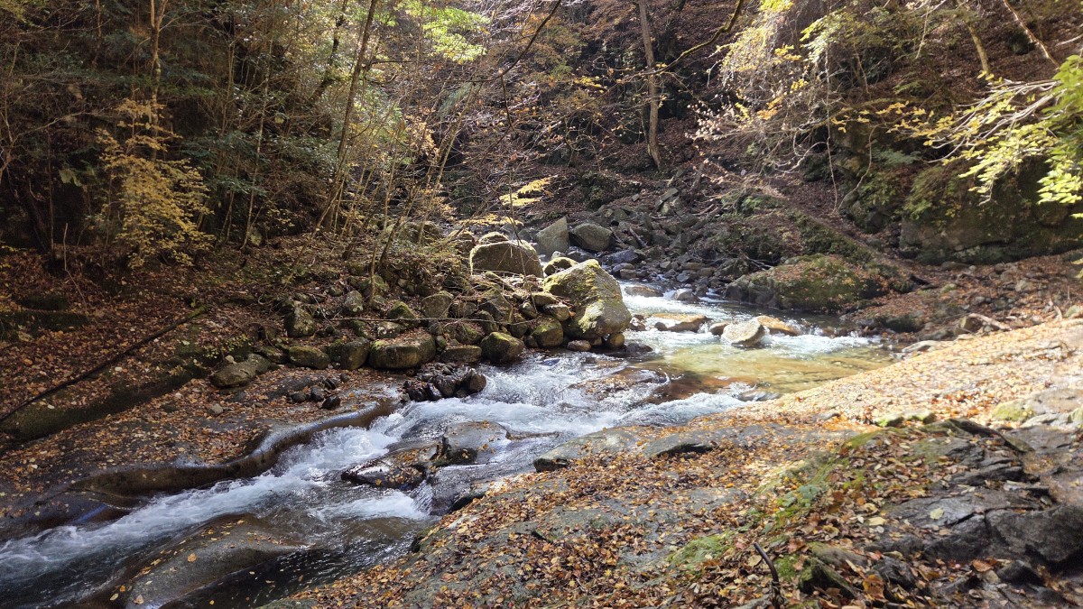 Druga połowa szlaku była dużo łatwiejsza niz pierwsza. Poprowadzona górą, z daleka od wody. Było to łagodne zejście biegnące po starym szlaku, który służył do zwożenia drzewa przy użyciu wózków. Z tego powodu co chwila napotykaliśmy na pozostałości po szynach kolejowych. Wokół nas były w zasadzie same lasy, do tego w pełnej swojej jesiennej okazałości. Cieszyliśmy oczy wszystkimi barwami jesiennych liści. Ta część poszła nam bardzo szybko, tym bardziej, że chcieliśmy jeszcze dojechać spokojnie do świątyni Mitsumine.
