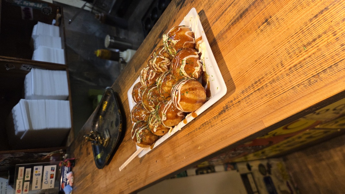 Rozwiesiliśmy pranie w naszym pokoju, nadrobiłem bloga i poszliśmy na jedzonko. Wzięliśmy takoyaki, czyli kulki z ośmiornicą. Było nawet niezłe, ale to jedzenie jest bardziej przekąską niż kolacją, więc poszliśmy jeszcze do knajpy, gdzie zjedliśmy wołowinę z ryżem i to był bardzo dobry wybór 😊