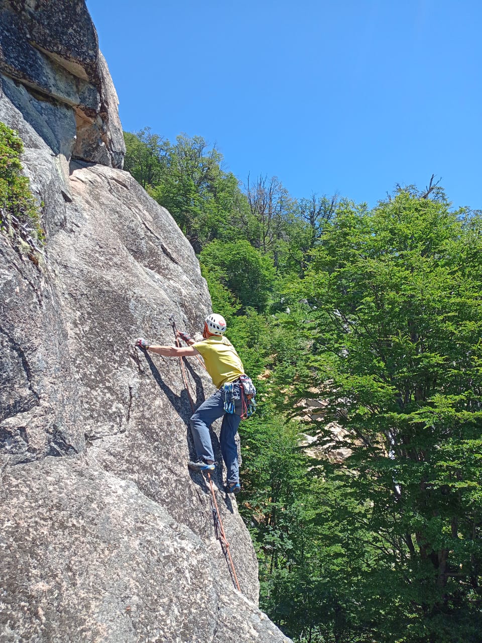 Dzisiaj wspinanko. Podejście dosyć trickowe, bo druga część przebiegała wzdłuż strumienia i bez Dylana, który znalazł i obijał skałę to mam wątpliwości czy ktokolwiek zdołałby mi wytłumaczyć jak tam dojść. No ale nie musieliśmy się tym zbytnio przejmować. Skała to granit i wbiłem się pierwszy, żeby zawiesić wędkę, ale plany się zmieniły i przeszliśmy na wielowyciąg. Pierwszy wyciąg jest techniczny, miał kilka miejsc które trzeba było rozkminić, bo nie było za dużo stopni albo chwytów, ale udało się bez problemu. W drugim nastąpiła zmiana na prowadzeniu. Musieliśmy trochę strawersować, bo pierwszy wyciąg nie był częścią wielowyciagu. Eric miał pewne problemy i skończył na A0. Szedłem drugi i absolutnie się nie dziwię, droga była połogiem, ale prawie pionem bez chwytów i z iluzorycznymi stopniami. Bardzo wymagająca, ale udało się przejść pierwszy crux. Niestety w drugim poszedłem na wprost, zamiast bardziej z lewej i się ukrzyżowałem, wszedłem za wysoko, ręce zostały nisko, dupa daleko od ściany, a nie znalazłem chwytu albo stopnia na tyle dobrego żeby to skorygować i odpuściłem. Ogólnie to trochę ściągało mnie na prawo, bo okazało się że ta droga się kończy po tym wyciągu, więc Eric strawersował do stanowiska z drogi obok (tej którą w umie chcieliśmy iść. Jak się okazało wyciąg był za 6c 😅 Ostatni wyciąg już był dobry. Na szczycie się rozwiązaliśmy, trochę pogadaliśmy i zamotaliśmy zjazd. Zdecydowaliśmy się na zjazd równoległy, pierwszy w moim życiu. Całkiem ciekawe, ale preferuję klasyczne zjazdy.