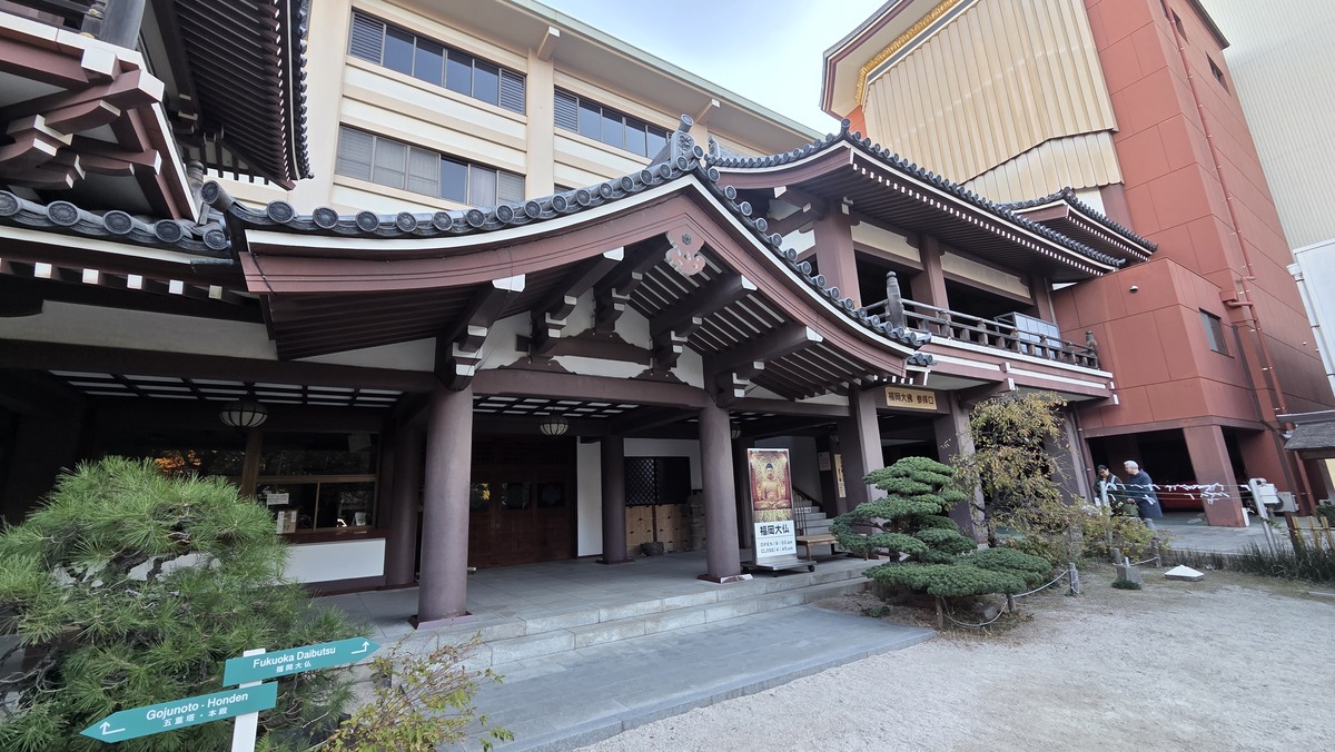 Przyjechaliśmy rano do Fukuoki. Zostawiliśmy bagaże w automatycznej skrzynce na nie. Schowek działa na kartę IC, w taki sposób że otwiera się ją tą samą kartą, którą się zapłaciło. Udało się nam tam włożyć wszystkie rzeczy, więc z jednym plecakiem na bieżące rzeczy poszliśmy się przejść po mieście. Udaliśmy się w stronę morza i części portowej. Po drodze zatrzymaliśmy się jeszcze w jakiejś świątyni.