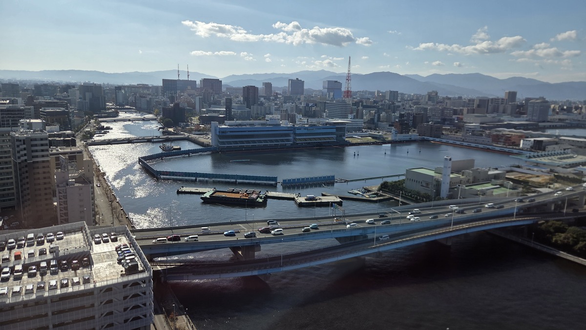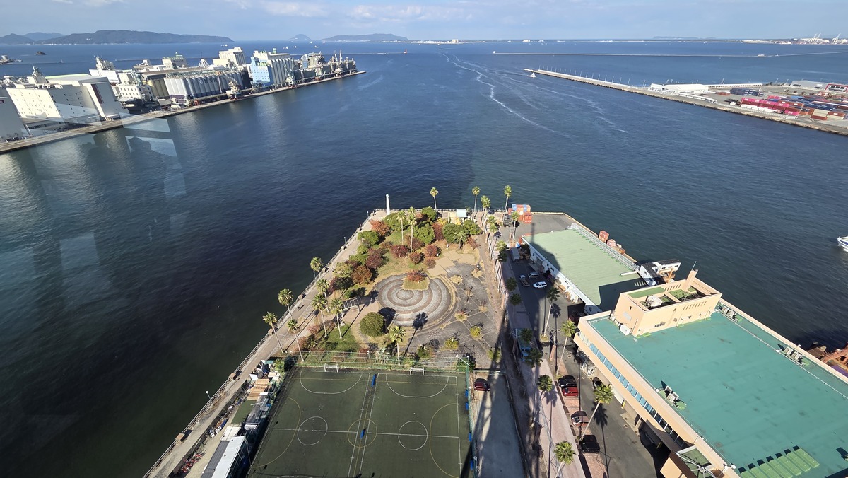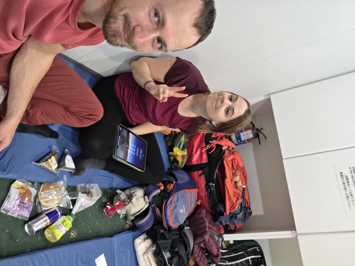 Posiedzieliśmy chwilę nad morzem i weszliśmy na wieżę obserwacyjną. Wracając z powrotem w kierunku dworca, zachaczamy jeszcze o jakieś sklepy z ubraniami albo używaną elektroniką. Zjadamy obiad na dworcu i idziemy na pociąg. Nasza jedyna podróż Shinkansenem. 90km w 15 minut. Poszło bardzo sprawnie. Fajnie obserwować jak “towja lokalizacja” na mapach się tak szybko przesuwa. Przesiedliśmy się w lokalny pociąg, a następnie poszliśmy na terminal promowy. Tam zaczekaliśmy godzinę do naszego promu i się zaokrętowaliśmy. Mieliśmy kajutę na jakies 15 osób, czyli pokój z materacami i pościelą. W końcu trochę przestrzeni i udało się nawet trochę pospać. Ze wszystkich rodzajów transportu publicznego, promy są moim ulubionym.