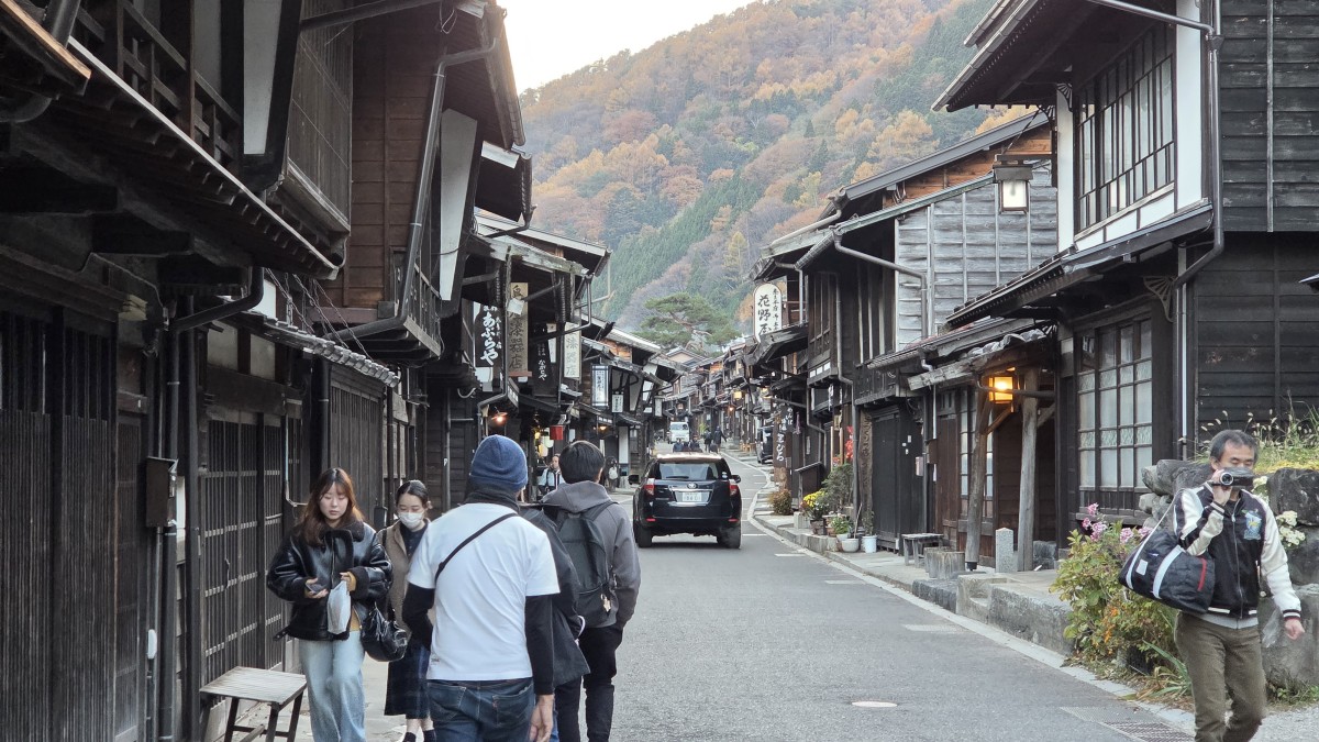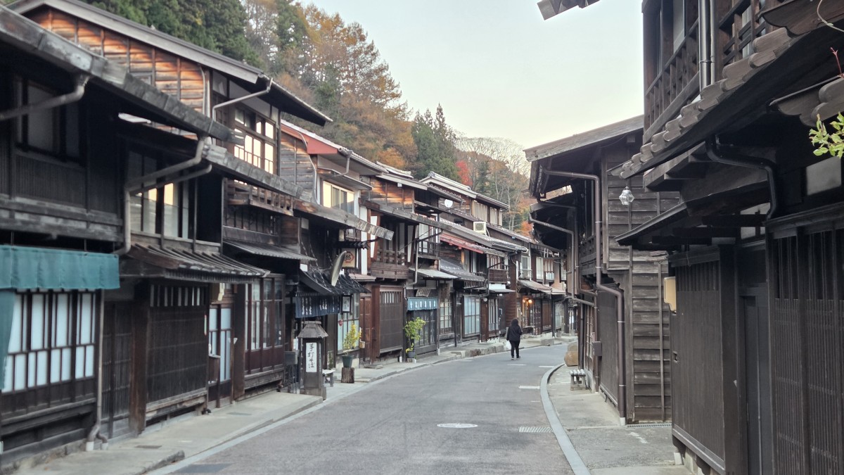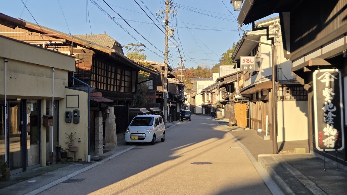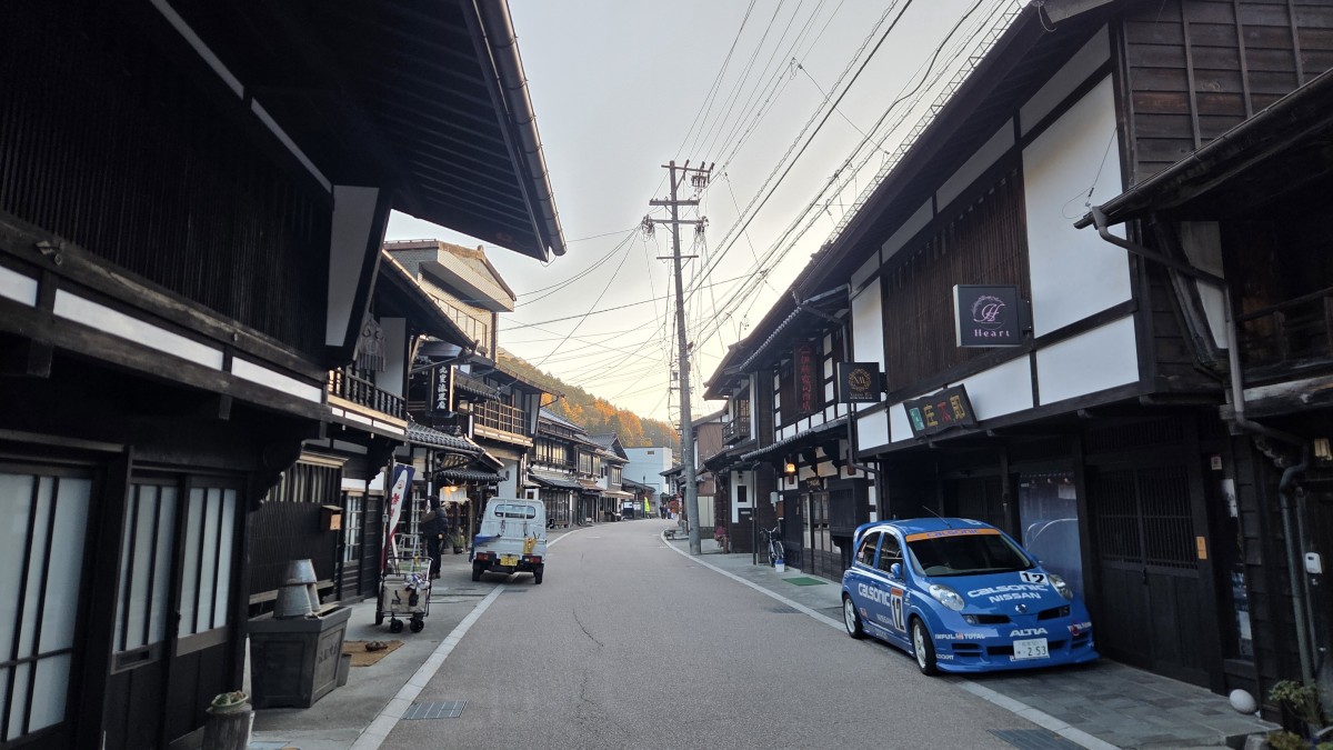 Po zwiedzaniu pojechaliśmy dalej w kierunku miasteczek na szlaku pocztowych. Podobno jedne z lepiej zachowanych uliczek, które oddają ducha tamtych czasów. Pierwsze miasteczko było puste, my przemarznięci i oprócz architektury niewiele widzieliśmy. Drugie było bardziej żywe, ale jakoś szczególnie. Widać było, że wszystko już się zamyka. Planowaliśmy tutaj obiad, ale restauracja, którą znaleźliśmy była już zamknięta. Poszlajaliśmy się więc po uliczkach i pojechaliśmy do innej restauracji, do onsenu i na spanie.